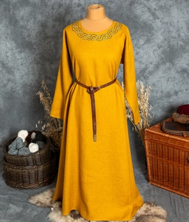 Early Medieval linen dress with hand-embroidered round neckline