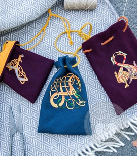 AUMONIERE - late medieval wool l pouch/ purse for coins with yellow embroidery and fringe