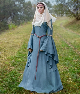 Prosta wczesnośredniowieczna lniana suknia z dwoma klinami i rozcięciem przy dekolcie
