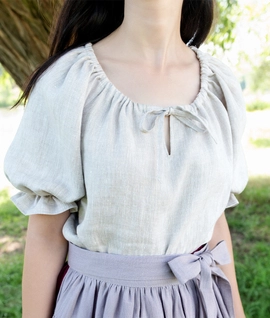Rustykalna lniana bluzka z bufkami i plisowanym dekoltem