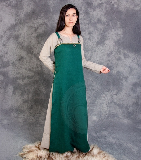 Lniany bajkowy fartuszek wikiński z ozdobną tasiemką i wiązaniem po bokach