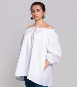 Lniana bluzka z odkrytymi ramionami, ściąganym dekoltem i ukrytymi kieszeniami