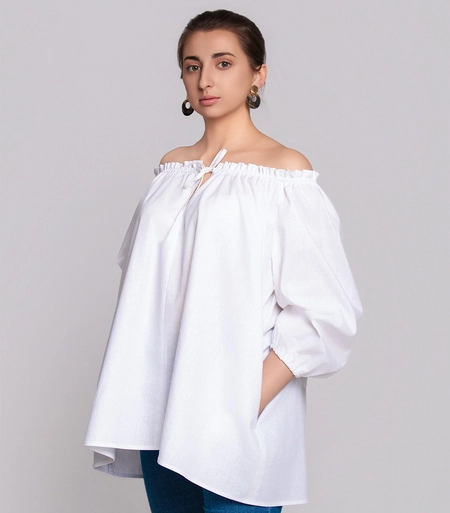 Lniana bluzka asymetryczna z krótkimi bufiastymi rękawami i haftem na ramionach