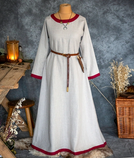 Wczesnośredniowieczna lniana sukienka z okrągłym dekoltem i wąskimi lnianymi obszyciami