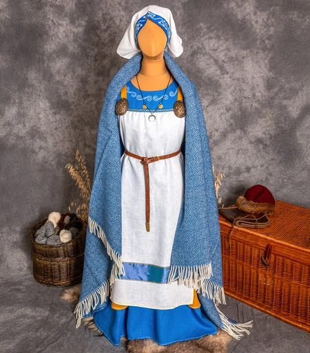 VELIKA — Wczesnośredniowieczny bogaty lniany 4-częściowy ręcznie haftowany strój damski