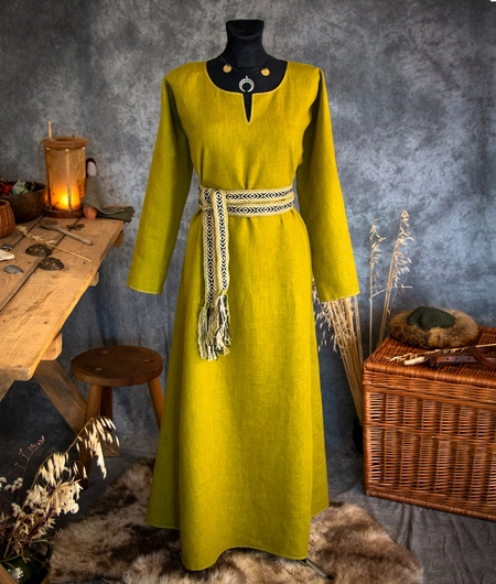 Wczesnośredniowieczna lniana sukienka z krajką na dekolcie i rękawach