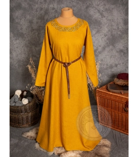 Wczesnośredniowieczna lniana sukienka z ręcznie haftowanym okrągłym dekoltem