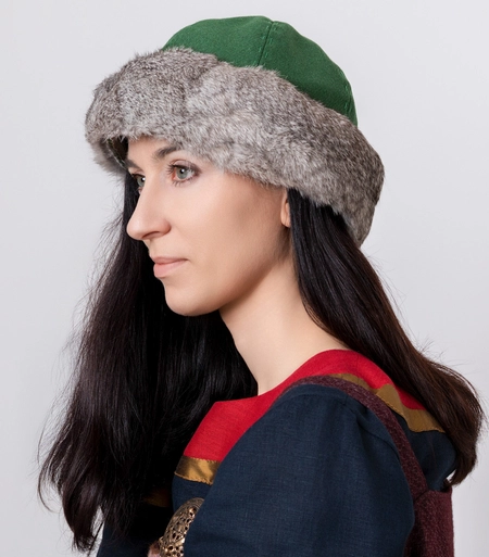 Viking round wool hat with linen lining and grey rabbit fur trim