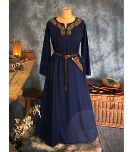 Skandynawska bogata wełniana sukienka z ręcznie haftowanym dekoltem