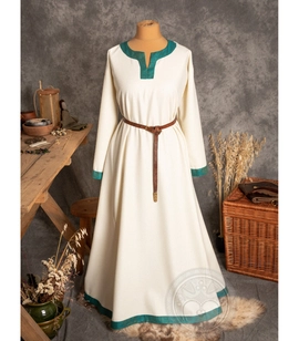 Wczesnośredniowieczna szeroka wełniana suknia ozdobiona wełnianymi obszyciami w kratkę